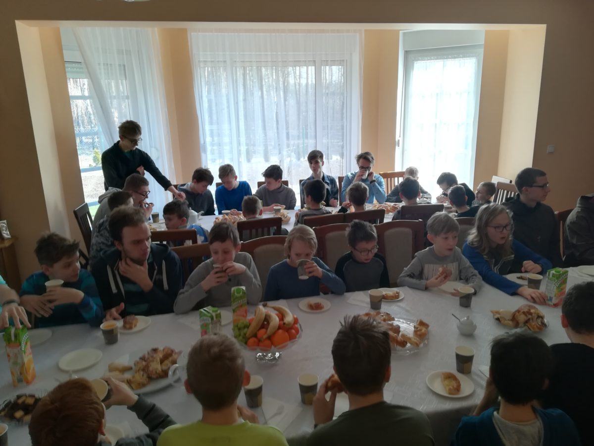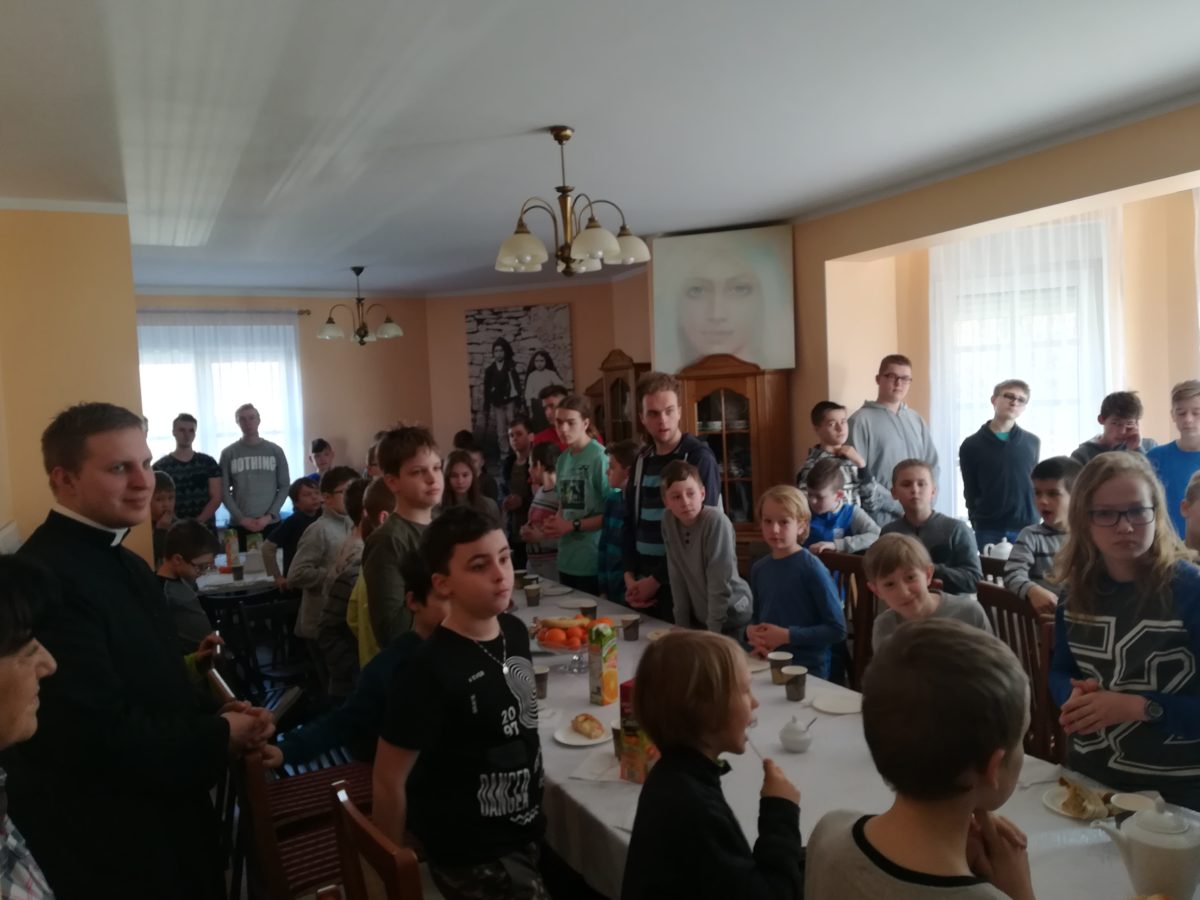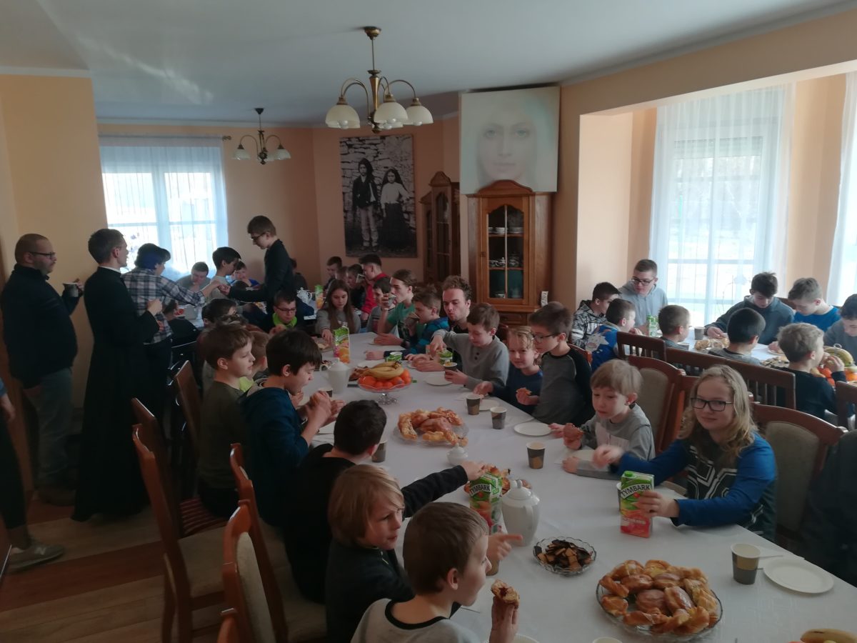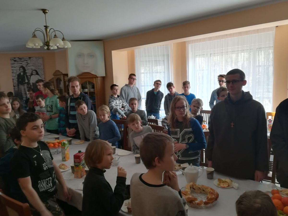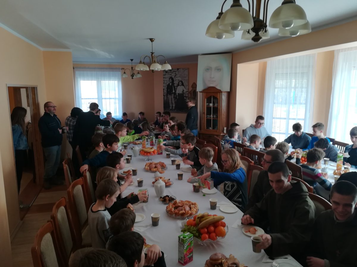 Po zakończonej Mszy Świętej był czas na wspólne biesiadowanie przy syto-słodkim zastawionym stole. Ks. Dziekan Jerzy Ranke, przygotował obfity poczęstunek na plebani. Następnie był czas na pracę w grupach, którym przewodniczyli Bracia Postulanci. Na koniec Dnia Skupienia ks. Dziekan udzielił wszystkim błogosławieństwa.