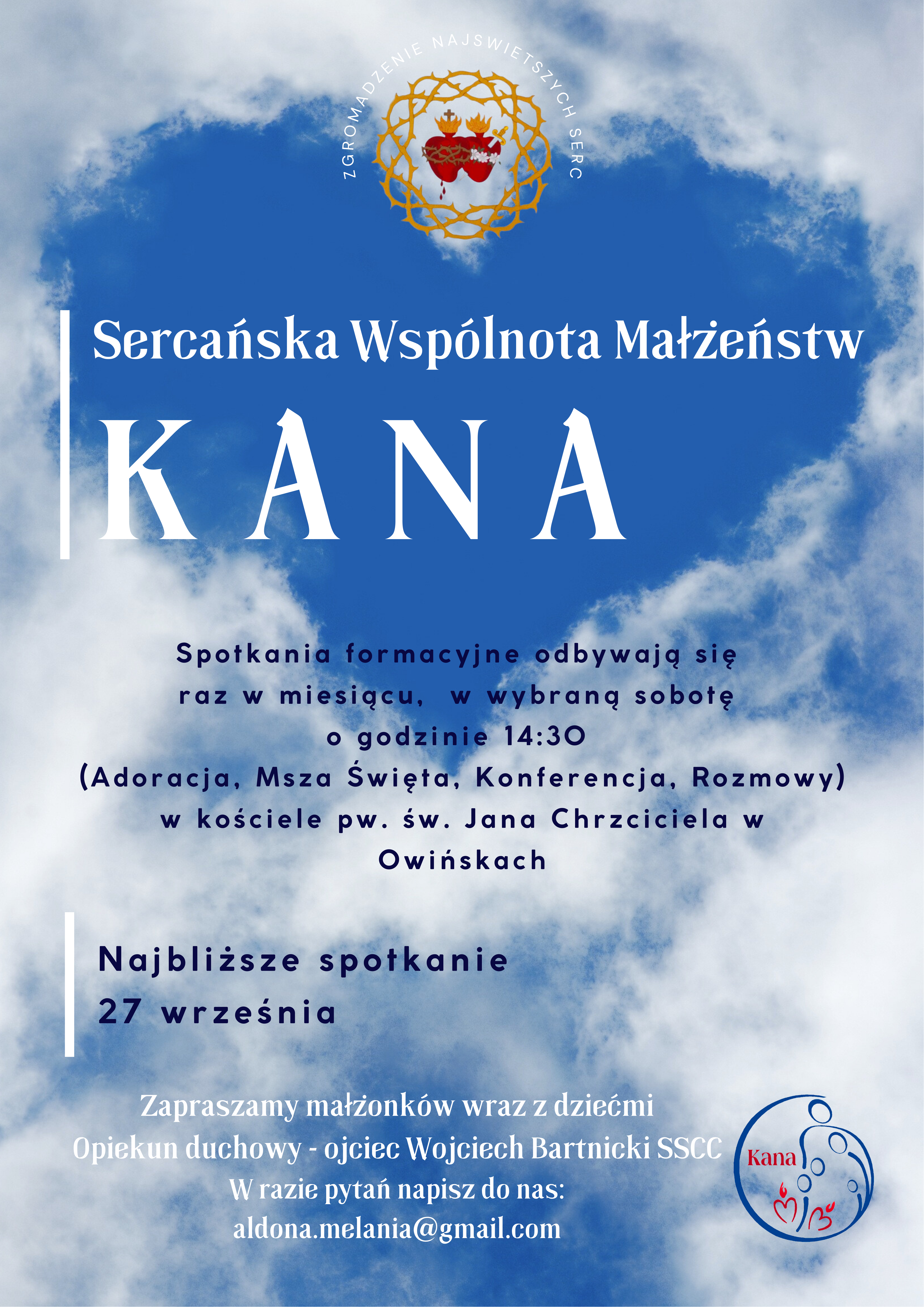 Sercańska Wspólnota Małżeństw „Kana” Zaprasza › Aktualności › Sercańska Wspólnota Małżeństw „Kana” Zaprasza Redaktor 20-09-2025 Sercańska Wspólnota Małżeństw „Kana” Zaprasza małżonków wraz z dziećmi. —————————————– Najbliższe spotkanie w sobotę 27 września br. w kościele pw. Św. Jana Chrzciciela w Owińskach. Więcej informacji na poniższym plakacie: …. oraz na zakładce „Wspólnoty” na stronie internetowej parafii /podgląd/